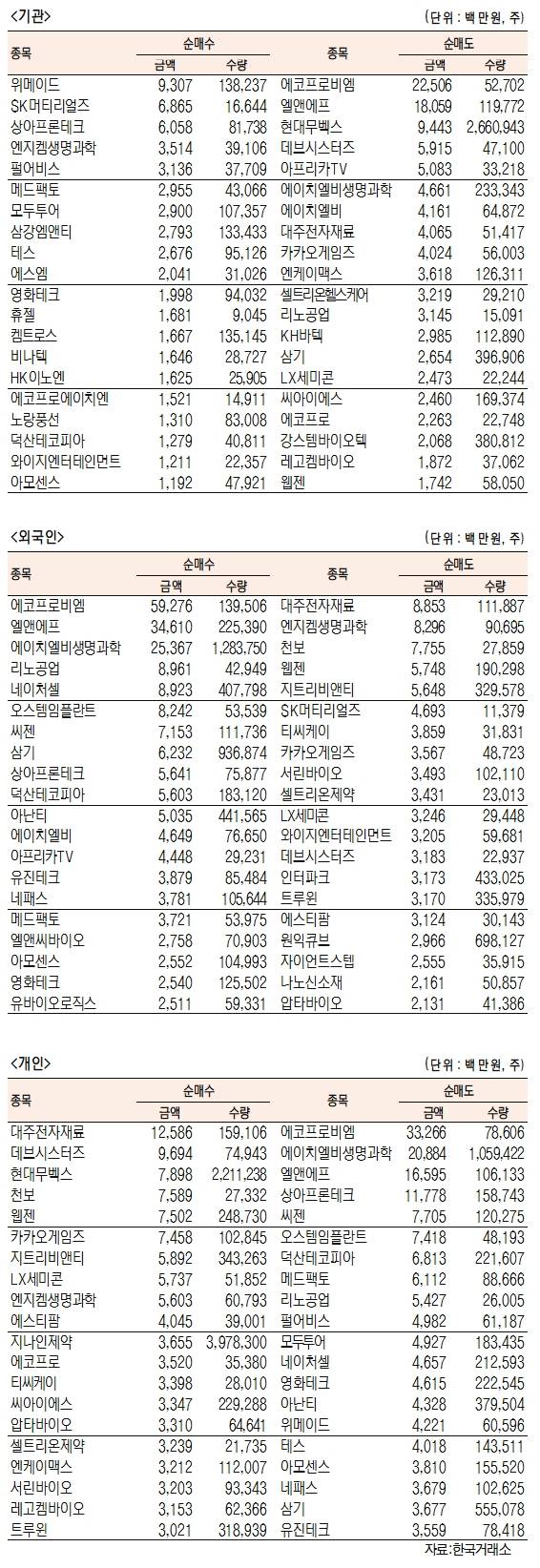 - [표]주간 코스닥 기관·외국인·개인 순매수·도 상위종목(9월 6~10일)