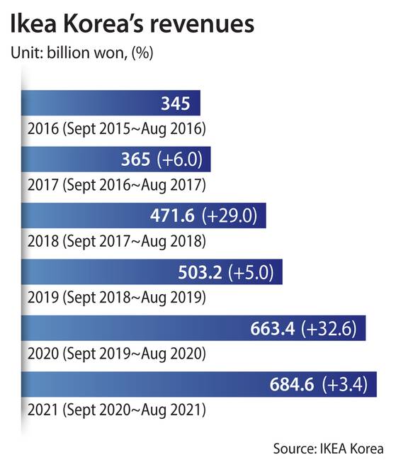 Other businesses selling furniture and household effects flourished during the Covid-19 pandemic as people were forced to stay home and became more interested in decorating their houses. Ikea Korea was no exception in fiscal 2020, when revenues rose 32.6 percent on year to 663.4 billion won. That was the biggest on year growth for the company.