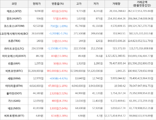 또한, 트론(10.24%, 140원), 헌트(6.48%, 936원), 네오(5.64%, 61,810원), 폴카닷(5.52%, 44,380원), 테조스(5.03%, 9,090원), 가스(4.15%, 12,050원), 비트토렌트(3.38%, 4.89원), 이더리움(1.18%, 4,016,000원), 리플(0.78%, 1,295원)이 상승세를 나타냈다.