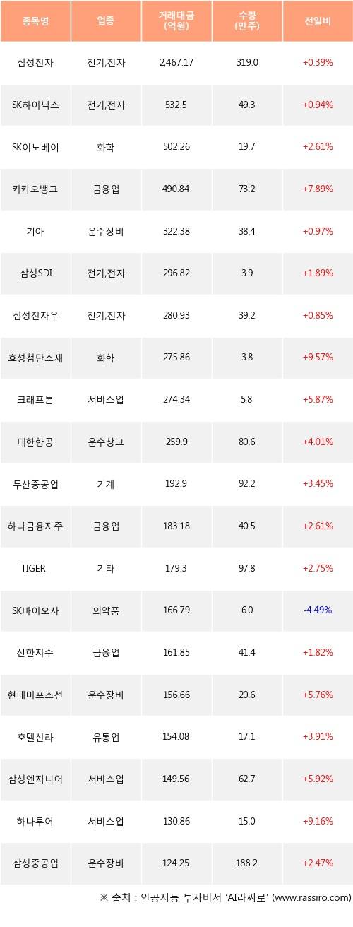 외국인 투자자의 순매수 상위 20개 종목은 삼성전자, SK하이닉스, SK이노베이션, 카카오뱅크, 기아, 삼성SDI, 삼성전자우, 효성첨단소재, 크래프톤, 대한항공등이다.