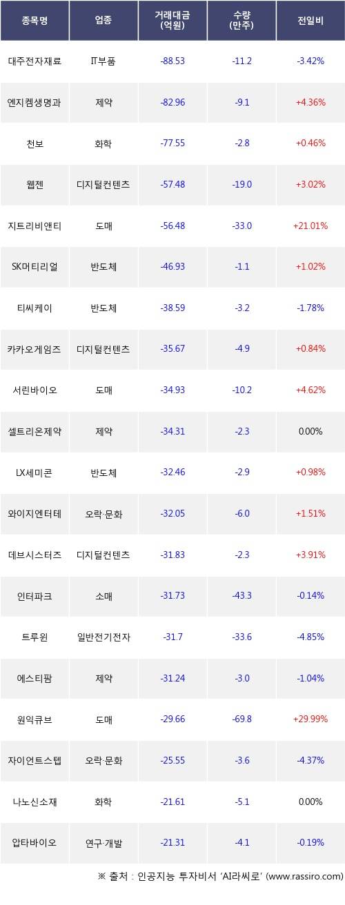 외국인 투자자의 순매도 상위 20개 종목은 대주전자재료, 엔지켐생명과학, 천보, 웹젠, 지트리비앤티, SK머티리얼즈, 티씨케이, 카카오게임즈, 서린바이오, 셀트리온제약등이다.