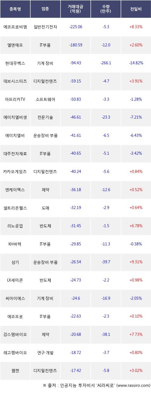 기관 투자자의 순매도 상위 20개 종목은 에코프로비엠, 엘앤에프, 현대무벡스, 데브시스터즈, 아프리카TV, 에이치엘비생명과학, 에이치엘비, 대주전자재료, 카카오게임즈, 엔케이맥스등이다.