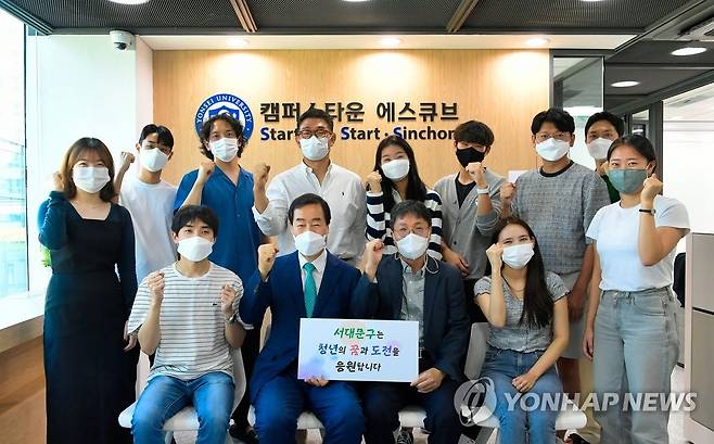 (서울=연합뉴스) 문석진 서울 서대문구청장(앞줄 왼쪽 두 번째)이 14일 오후 서울 서대문구 연세대 캠퍼스타운 에스큐브 2호점을 방문해 '서대문구는 청년의 꿈과 도전을 응원합니다'란 팻말을 들고 입주 창업팀 청년들과 함께 파이팅을 외치고 있다. 2021.9.14 [서대문구청 제공. 재판매 및 DB금지]