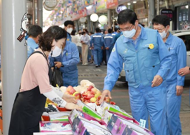 포스코 포항제철소 임직원 200여 명은 14일 포항 남구 해도동 큰동해시장을 찾아 명절 제수와 추석 선물을 구매하고 시장 내 식당에서 점심을 먹었다. 포항 큰동해시장에서 장을 보는 남수희 포스코 포항제철소장. 2021.9.14 [포스코 제공. 재판매 및 DB 금지]