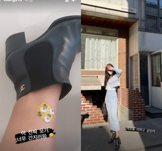 특히 김성은은 "아 진짜 모기 너무 간지러워"란 맨트와 함께 모기에 물린 다리 사진을 공개, 귀여운 반창고를 붙인 모습이 웃음을 자아낸다. 무엇보다 'C'사 명품 구두를 신은 모습도 눈길을 끌었다.