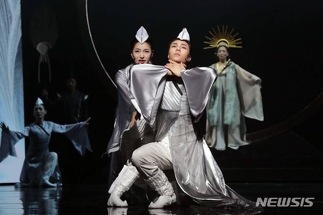 [서울=뉴시스] 박진희 기자 = 국립창극단이 14일 서울 중구 국립극장 해오름극장에서 '흥보전' 프레스콜을 하고 있다. 이번 공연은 판소리 연출가 김명곤과 대명창 안숙선이 참여하여 우리 소리의 격조를 지켜내며 고전의 현대적 변주를 시도한 작품이다. 2021.09.14. pak7130@newsis.com