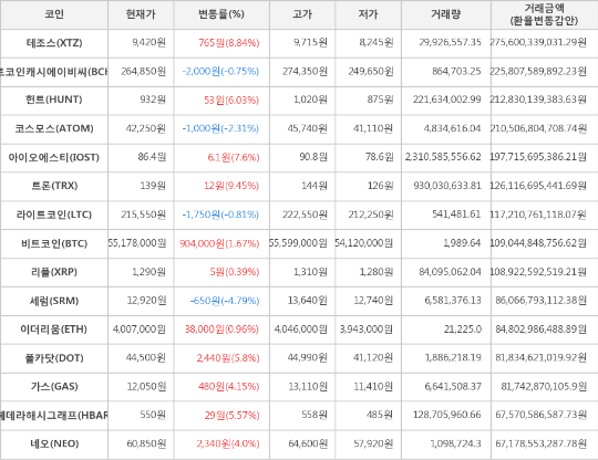 또한, 테조스(8.84%, 9,420원), 아이오에스티(7.6%, 86.4원), 헌트(6.03%, 932원), 폴카닷(5.8%, 44,500원), 헤데라해시그래프(5.57%, 550원), 가스(4.15%, 12,050원), 네오(4.0%, 60,850원), 이더리움(0.96%, 4,007,000원), 리플(0.39%, 1,290원)이 상승세를 나타냈다.