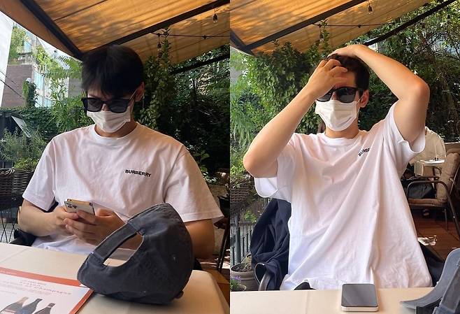 사진 속 차은우는 야외 테라스에서 여유를 즐기는 모습이다. 캡 모자와 마스크를 착용해 눈만 보이는 가운데 그는 조각 미모를 뽐냈다.