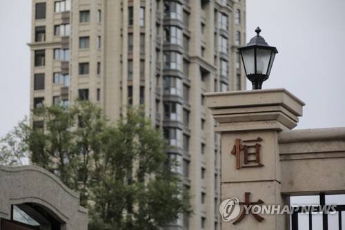 epa09467221 The Evergrande name seen outside an Evergrande housing complex in Beijing, China, 14 September 2021. Chinese property developer Evergrande said on 14 September that its property sales will likely continue to drop significantly in September, resulting in a further deterioration of its cash situation, according to media reports. EPA/WU HONG