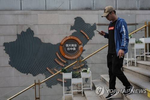 epa09467229 A man walks pass by a map showing Evergrande commercial in China at an Evergrande city plaza in Beijing, China, 14 September 2021. Chinese property developer Evergrande said on 14 September that its property sales will likely continue to drop significantly in September, resulting in a further deterioration of its cash situation, according to media reports. EPA/WU HONG