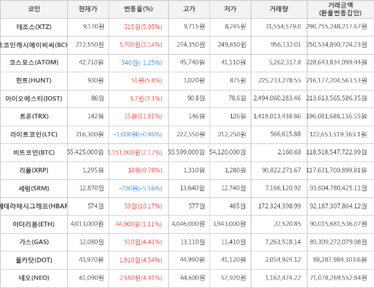 또한, 헤데라해시그래프(10.17%, 574원), 아이오에스티(7.1%, 86원), 테조스(5.95%, 9,170원), 헌트(5.8%, 930원), 폴카닷(4.54%, 43,970원), 네오(4.41%, 61,090원), 가스(4.41%, 12,080원), 비트코인캐시에이비씨(2.14%, 272,550원), 이더리움(1.11%, 4,013,000원), 리플(0.78%, 1,295원)이 상승세를 나타냈다.