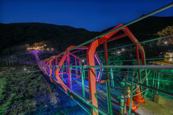 경남 산청군 동의보감촌에 설치된 211m 길이의 출렁다리 무릉교가 14일 개통됐다. 사진은 무릉교 야경. 연합뉴스