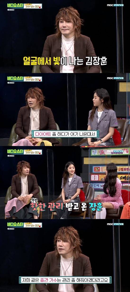이날 '비스' MC들은 김장훈의 모습에 "얼굴에서 빛이 난다. 관리 비결이 무엇이냐"고 궁금해했고, 김장훈은 "다이어트를 좀 하다가 '비스'에 나온다고 해서 리프팅과 링클케어를 두 번 정도 했다. 저희같은 중견가수는 관리 좀 해야한다. 그게 예의다. 저번 방송에서 관리를 안안 했더니 사람이 아니더라"고 말해 웃음을 자아냈다.