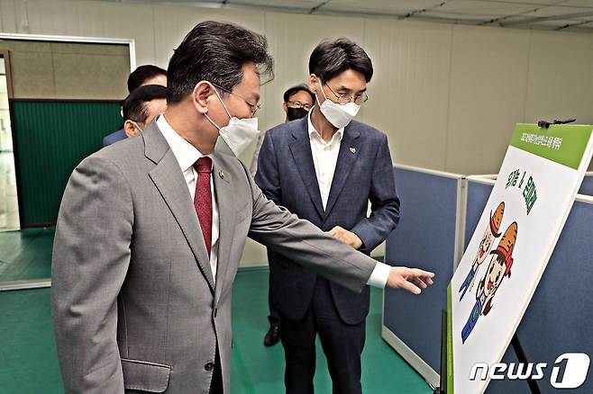(서울=뉴스1) = 고규창 행정안전부 차관이 14일 오후 충청북도 괴산국민체육센터에 위치한 '2022 괴산세계유기농산업엑스포' 조직위원회를 방문해 운영현황을 청취하고 향후 지원사항에 대한 의견을 나누고 있다. (행정안전부 제공) 2021.9.14/뉴스1
