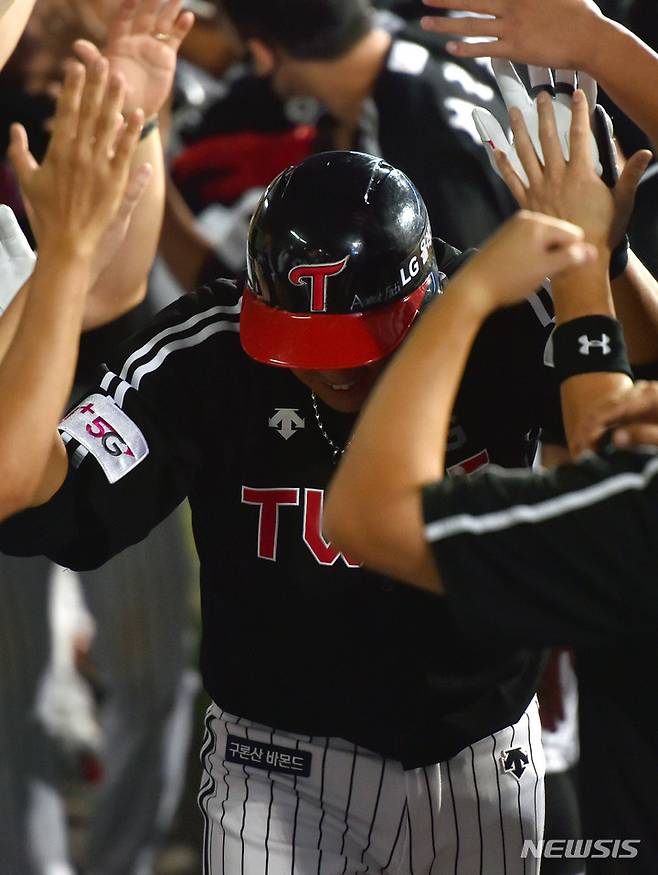 [대구=뉴시스] 이무열 기자 = 14일 오후 대구 수성구 삼성라이온즈파크에서 열린 ‘2021 신한은행 SOL KBO리그’ 삼성 라이온즈와 LG 트윈스의 경기, 5회초 2사 2루 상황에서 LG 채은성이 좌월 투런 홈런을 때린 후 덕아웃에 들어서며 동료들과 기뻐하고 있다. 2021.09.14. lmy@newsis.com