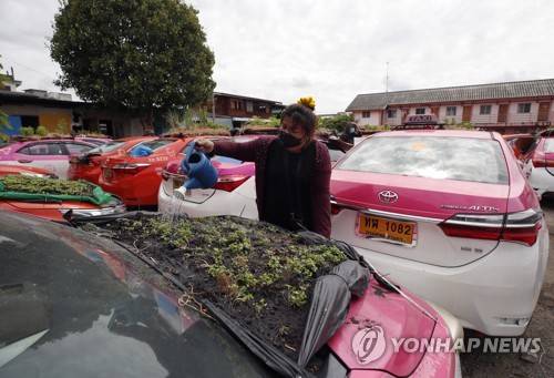 epa09467329 A Thai taxi company's staff member sprinkles water to plant vegetables on unused abandoned taxi cars parked at Ratchaphruek Taxi Cooperative in Bangkok, Thailand, 14 September 2021. A Thai owner of a taxi company allowed his employees to plant vegetables on its abandoned taxi cars as a source of food for consumption after thousands of its cabs were left unused by drivers who could not afford the rental fees due to the absence of tourists and economic crisis caused by the prolonged COVID-19 coronavirus pandemic. EPA/RUNGROJ YONGRIT