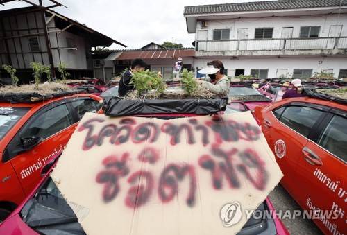epa09467332 A banner reading ÔCOVID ruin our life' is seen as Thai taxi company's staff members plant vegetables on unused abandoned taxi cars parked at Ratchaphruek Taxi Cooperative in Bangkok, Thailand, 14 September 2021. A Thai owner of a taxi company allowed his employees to plant vegetables on its abandoned taxi cars as a source of food for consumption after thousands of its cabs were left unused by drivers who could not afford the rental fees due to the absence of tourists and economic crisis caused by the prolonged COVID-19 coronavirus pandemic. EPA/RUNGROJ YONGRIT