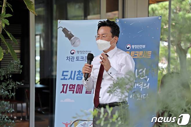 (서울=뉴스1) = 고규창 행정안전부 차관이 14일 오후 충청북도 괴산군 감물면 충민로 모하농 하우스에서 개최한 제2회 청년의날 기념 '지역청년과의 토크콘서트'에서 참석자들과 대화를 나누고 있다. (행정안전부 제공) 2021.9.14/뉴스1
