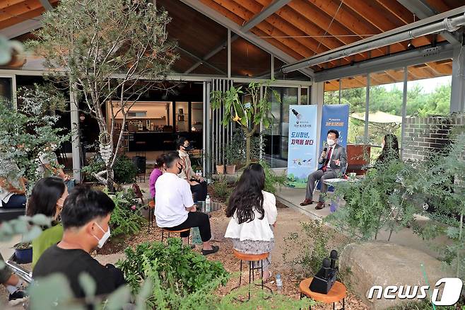 (서울=뉴스1) = 고규창 행정안전부 차관이 14일 오후 충청북도 괴산군 감물면 충민로 모하농 하우스에서 개최한 제2회 청년의날 기념 '지역청년과의 토크콘서트'에서 참석자들과 대화를 나누고 있다. (행정안전부 제공) 2021.9.14/뉴스1