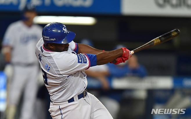 [대구=뉴시스] 이무열 기자 = 14일 오후 대구 수성구 삼성라이온즈파크에서 열린 ‘2021 신한은행 SOL KBO리그’ 삼성 라이온즈와 LG 트윈스의 경기, 8회말 1사 1루 상황에서 삼성 피렐라가 우중간 안타를 때리고 있다. 2021.09.14. lmy@newsis.com