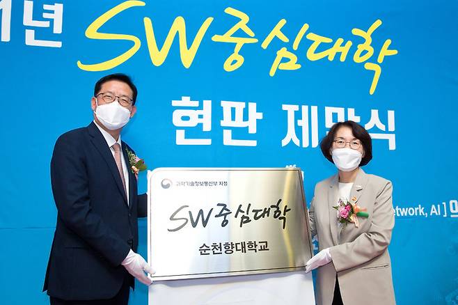 [서울=뉴시스] 정병혁 기자 = 임혜숙 과학기술정보통신부 장관이 14일 오후 충남 아산시 순천향대학교에서 열린 '소프트웨어 중심대학 현판 증정식' 에 참석해 김승우 순천향대학교 총장에게 현판을 전달하고 있다. (사진=과학기술정보통신부 제공) 2021.09.14. photo@newsis.com *재판매 및 DB 금지