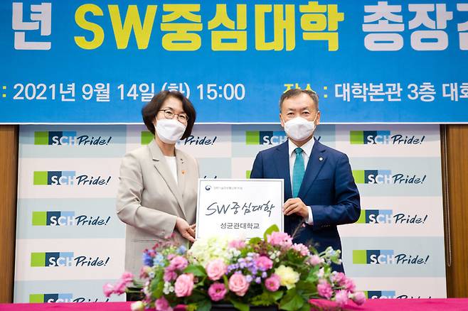 [서울=뉴시스] 정병혁 기자 = 임혜숙 과학기술정보통신부 장관이 14일 오후 충남 아산시 순천향대학교에서 열린 '소프트웨어 중심대학 현판 증정식' 에 참석해 신동렬 성균관대학교 총장에게 현판을 전달하고 있다. (사진=과학기술정보통신부 제공) 2021.09.14. photo@newsis.com *재판매 및 DB 금지