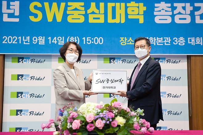 [서울=뉴시스] 정병혁 기자 = 임혜숙 과학기술정보통신부 장관이 14일 오후 충남 아산시 순천향대학교에서 열린 '소프트웨어 중심대학 현판 증정식' 에 참석해 전준철 경기대학교 기획처장에게 현판을 전달하고 있다. (사진=과학기술정보통신부 제공) 2021.09.14. photo@newsis.com *재판매 및 DB 금지