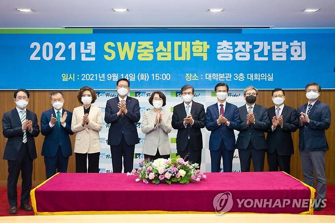 왼쪽부터 김원 가천대학교 부총장, 신동렬 성균관대학교 총장, 이진숙 충남대학교 총장, 김승우 순천향대학교 총장, 임 장관, 이강웅 한국항공대학교 총장, 김일목 삼육대학교 총장, 이강래 전남대학교 부총장, 전준철 경기대학교 기획처장, 이시철 경북대학교 부총장. 2021.9.14 [과학기술정보통신부 제공. 재판매 및 DB금지]