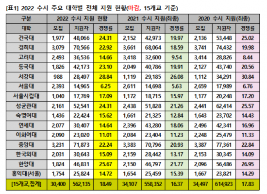 14일 종로학원에 따르면 이날 마감된 서울 15개 대학(건국대, 경희대, 고려대, 동국대, 서강대, 서울대, 서울시립대, 성균관대, 숙명여대, 연세대, 이화여대, 중앙대, 한국외대, 한양대, 홍익대)의 2022학년도 수시모집 평균 경쟁률이 18.49대 1로 지난해(16.37대 1)보다 상승했다.