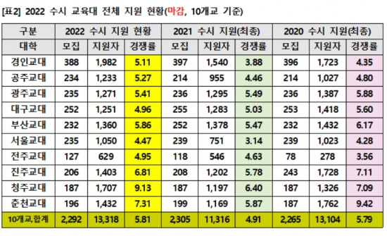 전국 10개 교대 수시 전체 평균 경쟁률은 5.81대 1로 작년(4.91대 1)보다 상승하였다. 광주교대, 대구교대를 제외하면 경인교대, 서울교대 등 8개교는 전년 대비 경쟁률이 높아졌다. 학령인구 감소에도 불구하고 전문직으로서의 교육대 선호 추세는 이어지고 있다.