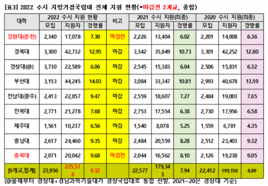 지방 거점 국립대 수시 모집 경쟁률도 대체로 상승했다. 의약계열 지역인재전형이 확대되고 학생부 종합전형에서 자기소개서가 폐지된 영향이다. 경북대와 부산대는 논술전형 지원자가 대폭 상승했다. 9개 대학 평균 경쟁률은 9.32대 1로 지난해 7.94대 1보다 소폭 상승했다.