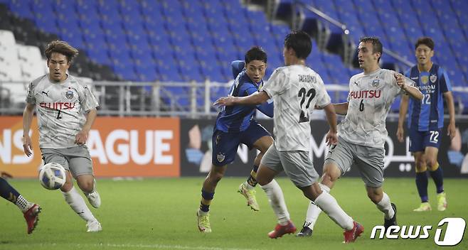 (울산=뉴스1) 윤일지 기자 = 14일 오후 울산 문수축구경기장에서 열린 프로축구 아시아축구연맹 챔피언스리그(ACL) 16강 울산현대와 가와사키 프론탈레의 경기에서 울산 이동준이 동료에게 패스하고 있다. 2021.9.14/뉴스1