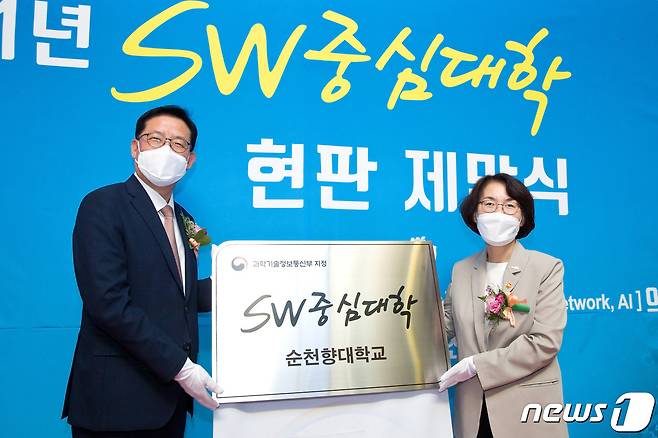 (서울=뉴스1) = 임혜숙 과학기술정보통신부 장관이 14일 오후 충청남도 아산시 순천향대학교에서 열린 '소프트웨어 중심대학 현판 제막식' 에 참석해 김승우 순천향대학교 총장에게 현판을 전달하고 있다. (과학기술정보통신부 제공) 2021.9.14/뉴스1