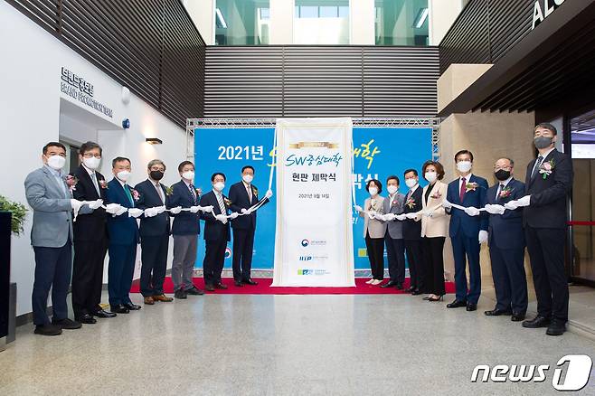 (서울=뉴스1) = 임혜숙 과학기술정보통신부 장관이 14일 오후 충청남도 아산시 순천향대학교에서 열린 '소프트웨어 중심대학 현판 제막식' 에 참석해 기념촬영 하고 있다. 왼쪽부터 김정삼 과학기술정보통신부 소프트웨어정책관, 이강웅 한국항공대학교 총장, 신동렬 성균관대학교 총장, 이강래 전남대학교 부총장, 이시철 경북대학교 부총장, 김 원 가천대학교 부총장, 김승우 순천향대학교 총장, 임혜숙 과학기술정보통신부 장관, 전성배 정보통신기획평가원장, 전준철 경기대학교 기획처장, 이진숙 충남대학교 총장, 김일목 삼육대학교 총장. (과학기술정보통신부 제공) 2021.9.14/뉴스1