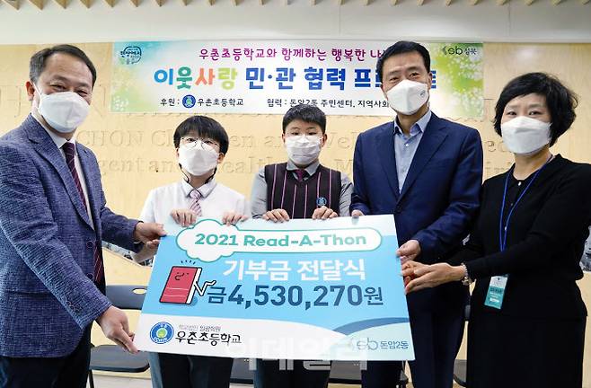 우촌초등학교 학생회는 전교생의 뜻을 모아 또래 학생을 돕기위해 ‘영어독서마라톤’(Read-a-thon)을 통해 모아진 기부금 4,530,270원을 돈암2동 주민센터에 전달했다.