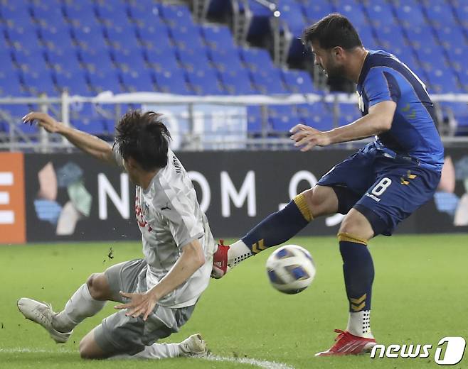 (울산=뉴스1) 윤일지 기자 = 14일 오후 울산 문수축구경기장에서 열린 프로축구 아시아축구연맹 챔피언스리그(ACL) 16강 울산현대와 가와사키 프론탈레의 경기에서 울산 바코의 슛이 가와사키 야스토에게 막히고 있다.2021.9.14/뉴스1