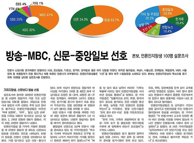 서울 소재 대학 언론고시반 학생, 세명대 저널리즘스쿨대학원 재학생, 대학생 인턴기자 출신 등 100명을 면접·이메일로 조사한 결과 입사를 가장 희망하는 방송사로 MBC가 꼽혔다.
