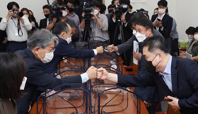 언론중재법 개정안을 논의할 여야 8인 협의체의 상견례 겸 첫 회의가 지난 8일 서울 여의도 국회 운영위 소회의실에서 열려 참석자들이 입장하며 인사하고 있다. 협의체는 14일 5차 회의까지 가졌으나 징벌적 손배제 도입, 열람차단청구권 신설 등 쟁점 사항에 대한 대립각이 이어지고 있다. /뉴시스