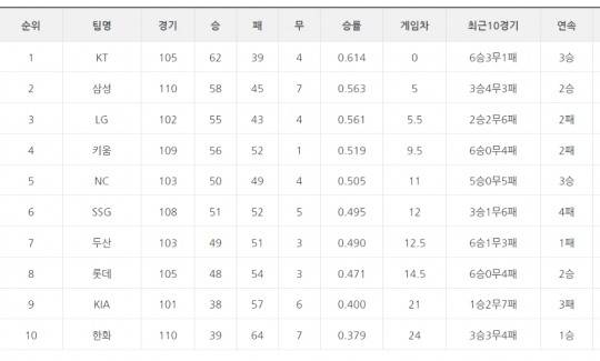 [프로야구 14일 팀순위]kt, 두산 연승 저지하며 2위와 더 게임차 벌여..NC 3연승, SSG 4연패로 희비 엇갈려..승부 못가린 LG와 삼성은 0.5게임차 유지