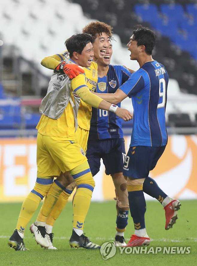 (울산=연합뉴스) 김용태 기자 = 14일 울산 문수축구경기장에서 열린 2021 아시아축구연맹(AFC) 챔피언스리그(ACL) 16강 울산 현대와 가와사키 프론탈레의 경기에서 승부차기로 승리한 울산 선수들이 환호하고 있다. 2021.9.14