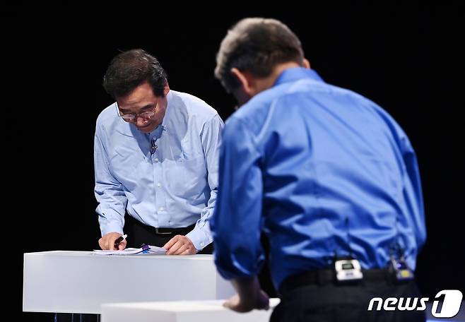 (서울=뉴스1) 국회사진취재단 = 더불어민주당 이낙연(왼쪽) 대선 경선 후보와 이재명 후보가 14일 오후 서울 마포구 상암동 MBC 사옥에서 열린 대선후보 100분 토론에 참석해 인사를 하고 있다. 2021.9.14/뉴스1