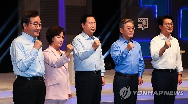 (서울=연합뉴스) 더불어민주당 이낙연(왼쪽부터), 추미애, 김두관, 이재명, 박용진 대선 경선 후보가 14일 오후 서울 마포구 상암동 MBC에서 열린 100분 토론에서 기념촬영을 하고 있다. 2021.9.14 [국회사진기자단]