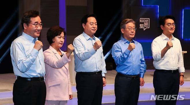 [서울=뉴시스] 국회사진기자단 = 더불어민주당 이낙연(왼쪽부터), 추미애, 김두관, 이재명, 박용진 대선 경선 후보가 14일 오후 서울 마포구 상암동 MBC에서 열린 100분 토론에 앞서 기념촬영하고 있다. 2021.09.14. photo@newsis.com
