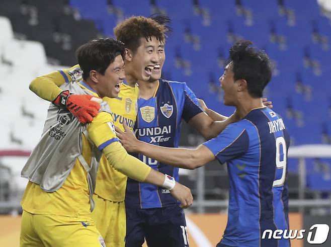 (울산=뉴스1) 윤일지 기자 = 14일 오후 울산 문수축구경기장에서 열린 프로축구 아시아축구연맹 챔피언스리그(ACL) 16강 울산현대와 가와사키 프론탈레의 경기에서 승부차기 접전 끝에 울산이 가와사키에 3대 2로 승리했다. 승리한 울산 선수들이 환호하고 있다. 2021.9.14/뉴스1
