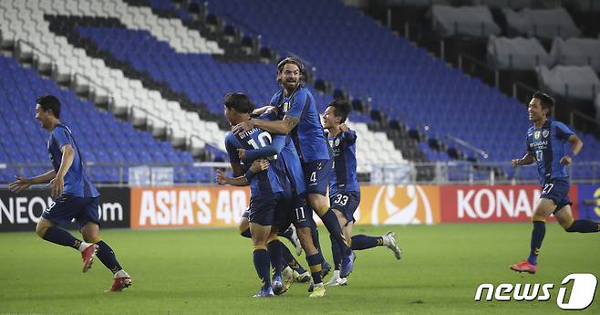 (울산=뉴스1) 윤일지 기자 = 14일 오후 울산 문수축구경기장에서 열린 프로축구 아시아축구연맹 챔피언스리그(ACL) 16강 울산현대와 가와사키 프론탈레의 경기에서 승부차기 접전 끝에 울산이 가와사키에 3대 2로 승리했다. 승리한 울산 선수들이 환호하고 있다. 2021.9.14/뉴스1