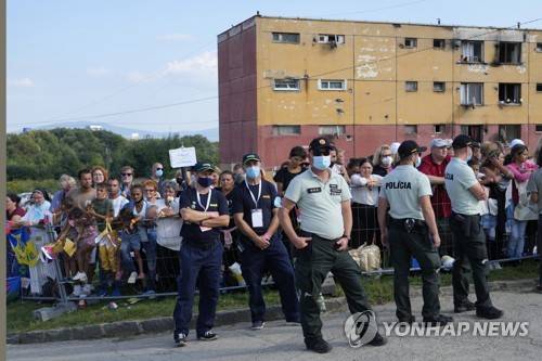 Residents wait for Pope Francis arrival to meet members of the Roma community at Lunik IX, in Kosice, Slovakia, Tuesday, Sept. 14, 2021, the biggest of about 600 shabby, segregated settlements where the poorest 20% of Slovakia's 400,000 Roma live. Pope Francis traveled to Kosice, in the far east of Slovakia on Tuesday to meet with the country's Roma in a gesture of inclusion for the most socially excluded minority group in Slovakia, who have long suffered discrimination, marginalization and poverty. (AP Photo/Gregorio Borgia)