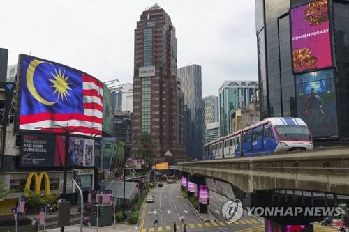 An LRT (Light Rain Transit) passes by a National flag signboard in Kuala Lumpur, Malaysia, Tuesday, Sept. 14, 2021. (AP Photo/Vincent Thian)