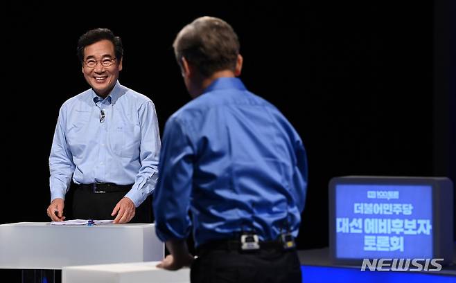 [서울=뉴시스] 국회사진기자단 = 더불어민주당 이재명, 이낙연 대선 경선 후보가 14일 오후 서울 마포구 상암동 MBC에서 열린 100분 토론을 준비하고 있다. 2021.09.14. photo@newsis.com