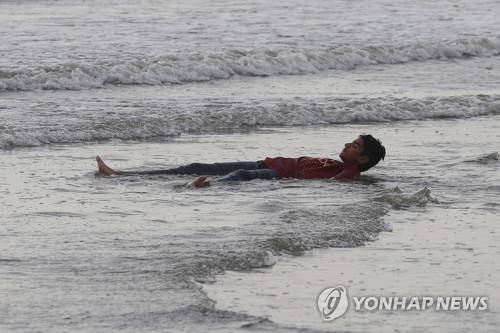 epa09467593 A pakistani boy cool off at the beach to beat the hot weather in Karachi, Pakistan, 14 September 2021. Pakistan's MET office issued a hot and humid weather forecast for Karachi till Sept 14, predicting that temperatures could rise up to 39 degrees Celsius. EPA/SHAHZIB AKBER