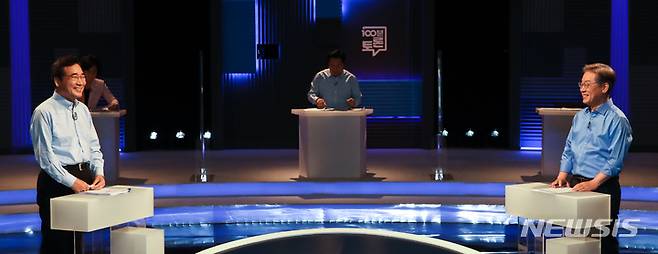 [서울=뉴시스] 국회사진기자단 = 더불어민주당 이재명, 이낙연 대선 경선 후보가 14일 오후 서울 마포구 상암동 MBC에서 열린 100분 토론을 준비하고 있다. 2021.09.14. photo@newsis.com